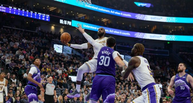 James, quien anotó la mayoría de sus puntos en contraataques y fuertes penetraciones al aro, añadió ocho asistencias y seis rebotes en 34 minutos. Logró 11 unidades y 12 asistencias en una victoria contra el Jazz el martes, en el primer partido de su 23ra temporada en la NBA. James se perdió el campamento de entrenamiento y los primeros 14 partidos de los Lakers debido a una ciática.