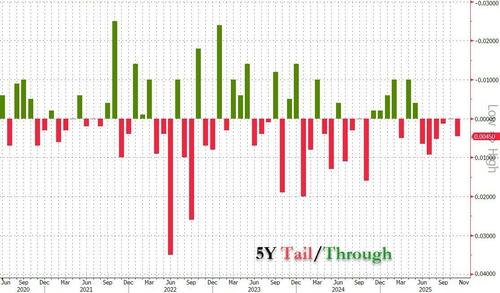 After yesterday’s sale of $69BN in 2Y notes, which came smack in the middle of market expectations with metrics that were just about average, moments ago the US Treasury sold $70BN in 5Y notes at a high yield of 3.562%, down from 3.625% last month and the lowest since last September when the Fed launched its current rate cut cycle; the auction tailed the When Issued 3.557% by 0.5bps, and was the 5th tailing 5Y auction of the past 6.