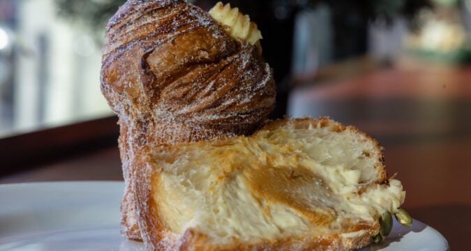 A towering cruffin, the cross between a croissant and muffin, has consistently become a bestseller with flavors changing every month. Tall and heavy yet tender, they hide not one, but two fillings. A recent ricotta and pumpkin cruffin held clouds of ricotta pastry cream intertwined with silken pumpkin ganache.