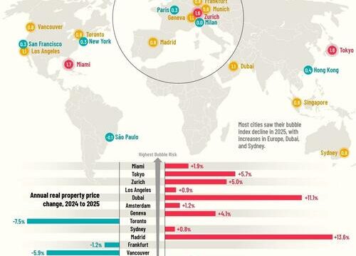 This infographic, via Visual Capitalist’s Niccolo Conte, shows the cities with the highest bubble risk worldwide based on the UBS Global Real Estate Bubble Index 2025.