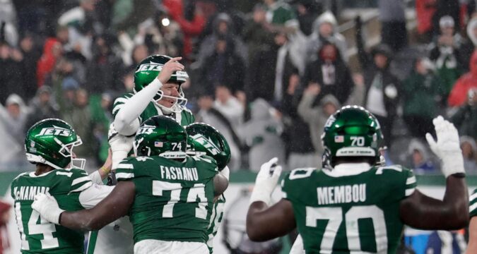 En un juego entre dos equipos en apuros que fue cualquier cosa menos bonito, el tiro de Folk tampoco lo fue. Pero en condiciones difíciles, el jugador de 41 años logró lo suficiente con el balón para recuperarse de un fallo anterior y fue rodeado en el centro del campo por sus compañeros mientras los aficionados de los Jets en un MetLife Stadium empapado y medio vacío enloquecían.