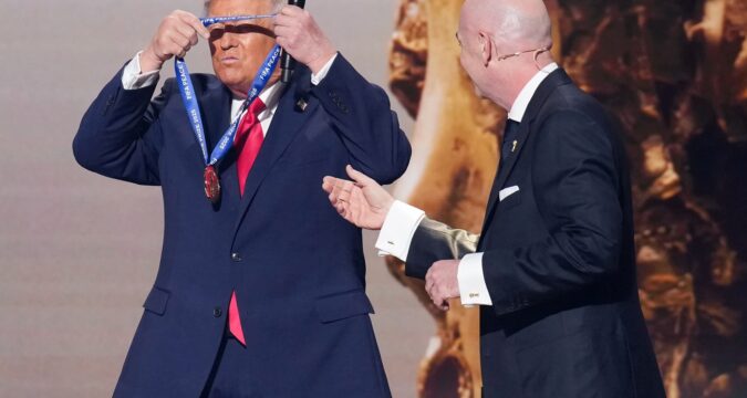 The U.S. president was awarded the prize that Infantino said was a “beautiful medal for you that you can wear everywhere you want to go.” Trump promptly placed the medal around his neck. The certificate that Infantino handed Trump recognizes the U.S. president for his actions to “promote peace and unity around the world.”