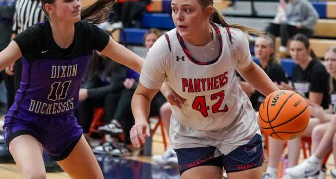 Oswego’s Kendall Grant (42) shoots the ball in the post against Dixon’s Kamille Prather (22) and Kiley Gaither during a nonconference game in Oswego on Monday, Dec. 8, 2025. (Sean King / The Beacon-News)