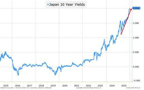 The Japanese 10-year bond yield broke 2% for this week. It spent most of the past decade below 0.5%.