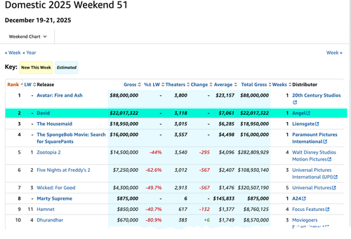 From December 19 to 21, Mojo’s data showed that David was in 3,118 theaters and earned $22 million over the weekend, placing it in the number two spot, just behind Avatar: Fire and Ash.