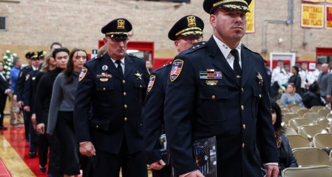 Police officers from various departments process past Park Forest Detective Tim Jones’ casket as part of an honorary walk-through before his celebration of life. (Dominic Di Palermo/Chicago Tribune)