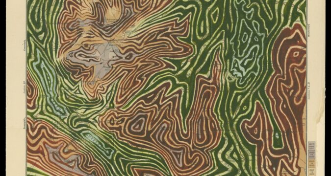 Over the centuries, mapmakers have experimented, innovated, and eventually standardized the representation of both natural and man-made features, often in keeping with scientific discovery. Once the floor of the Atlantic Ocean or a Chilean mountain range had been surveyed, charts needed to be drawn up to communicate that information, and it was hardly obvious how. Long-ago cartographers simply drew pictures of waves or mountains in the appropriate areas, but beginning in the 18th century, different types of lines began to be used to show depth and altitude on a flat surface. A display of books for teaching mapmaking illustrates the possibilities — and provides a surprising boon for figurative and abstract artists alike. Joseph Enthoffer’s “Types of Orography,” published in 1870 and concerning the geography of mountains, could be a page of erotic ink drawings. British artist Ed Fairburn caught the drift, as can be seen in his 2017 remake of an old map of Cardiff, painted over with squiggles of green and brown to bring out the portrait hiding therein.