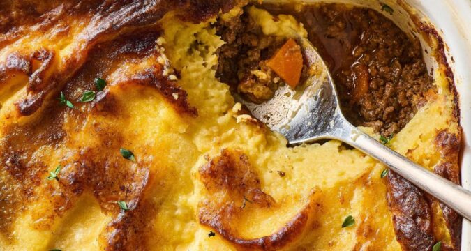 My version, like many today, relies on ground beef simmered with carrots and onions in red wine and beef broth. I like to add a dollop of Dijon mustard; it’s not traditional, but the sharpness balances the rich beef flavor in a way that tastes right to me. I add Gruyere cheese, egg yolks, and grated nutmeg to my mashed potato topping to ensure it’s rich, with a nutty depth that adds layered flavor to every bite. The top gets extra-golden in the oven, and every bite will make you extra-happy.