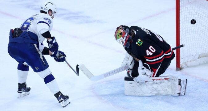 Chicago Blackhawks goaltender Arvid Soderblom (40) defends the goal as Tampa Bay Lightning center Anthony Cirelli (71) tries to score in the second period of a game at the United Center in Chicago on Jan. 23, 2026. (Chris Sweda/Chicago Tribune)