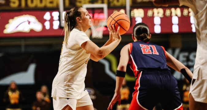 Western Michigan’s Mary Clare Brusek, a Marist graduate, gets ready to put up a shot against Dayton during a nonconference game on Thursday, Dec. 18, 2025. (Ashley Blanchard / WMU Athletics)