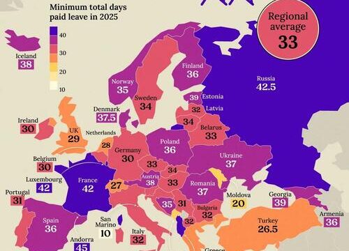This map, via Visual Capitalist’s Niccolo Conte, shows the minimum total number of paid leave days in Europe in 2025.
