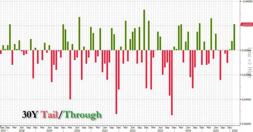 The auction stopped at a high yield of 4.750%, down from 4.825% in January, and the lowest since November. It also stopped through the 4.771% When Issued by 2.1bps, the biggest stop since LIberation Day in April 2025.