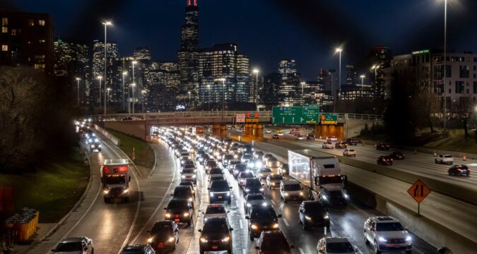 Vehicles crawl along the Eisenhower Expressway as a CTA Blue Line train rolls past during morning rush-hour traffic in Chicago on Feb. 12, 2026. (Antonio Perez/Chicago Tribune)