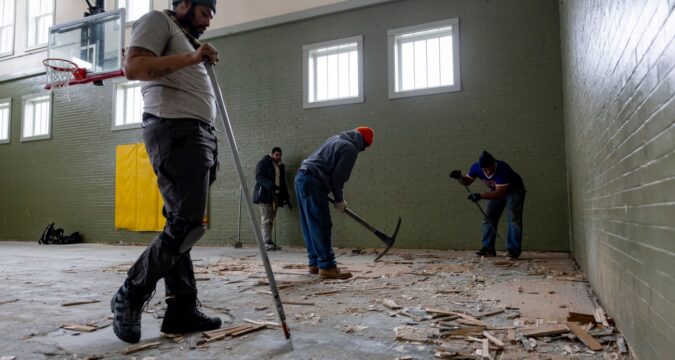 We walk into the gym, where workers are tearing up its wooden basketball court (not the original floor) with crowbars, stacking blonde slats in a corner. We pass its drained pool. We enter its grand ballroom, where a 30-foot-long mural, W.E. Scott’s “Mind, Body, Spirit,” has already passed through rounds of conservation. Its floor smells like sealant.