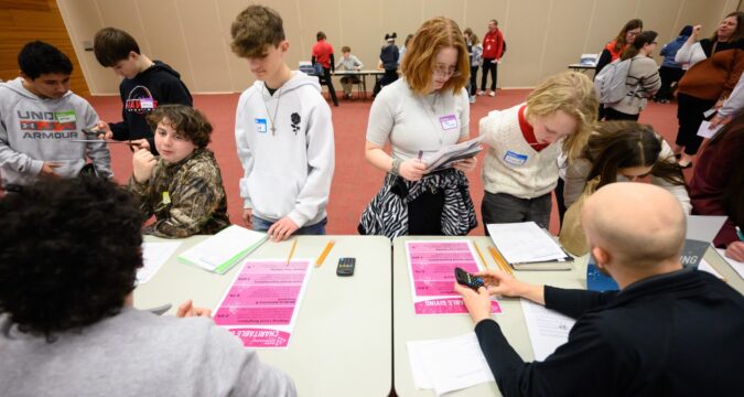Hebron Middle School students calculate their contribution to savings and retirement as they participate in a simulation exercise run by Junior Achievement of Northwest Indiana at Valparaiso University on Tuesday, March 3, 2026. (Kyle Telechan/for the Post-Tribune)