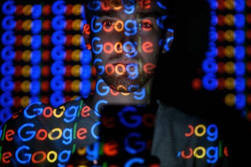 The Google logo is projected onto a man, in this photo illustration. Leon Neal/Getty Images