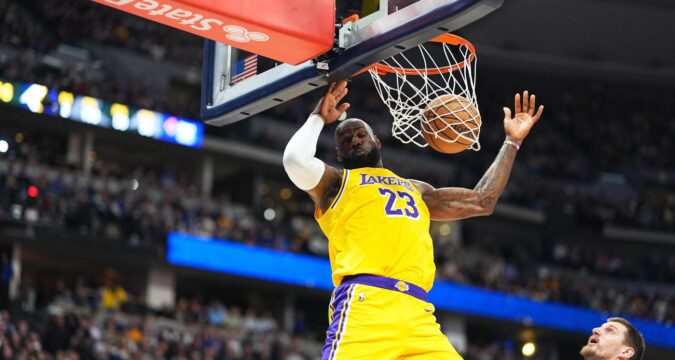 Además de su canasta que rompió el récord en el primer cuarto —el enceste de campo número 15.838 de su carrera de 23 años—, James atinó un par de disparos sensacionales: una bandeja en contragolpe con giro y finalización invertida, y un tiro en suspensión sobre una pierna, de espaldas al aro, desde 18 pies, que acercó a los Lakers a 64-54 al descanso.