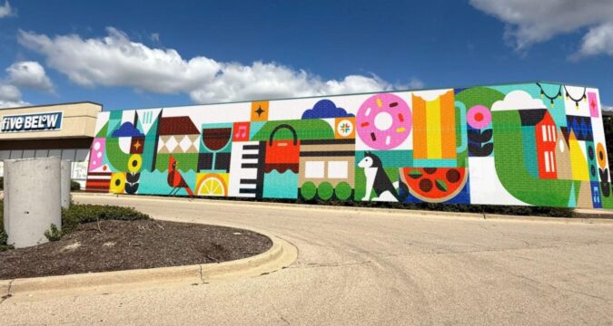 The mural planned for Five Below, by artist Alyssa Low, incorporates icons seen in Block 59 and throughout Naperville. Elements include a dog for Block 59 tenant Lazy Dog Restaurant and Bar, houses to represent Naperville’s stature as a family-friendly place, abstract shapes depicting Moser Tower and bridges along the Naperville Riverwalk, and a green, winding path connecting it all together — representing the Riverwalk itself.