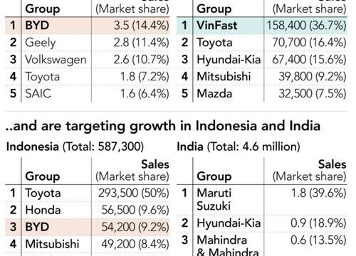 VinFast sold more than 100,000 vehicles across countries including Indonesia, Vietnam, and Thailand, while BYD delivered roughly 70,000 units. Together, they account for around 7% of total vehicle sales in a regional market of approximately 2.4 million cars. Their rapid growth has contributed to a decline in market share for long-dominant Japanese automakers such as Toyota, Honda, and Mitsubishi.