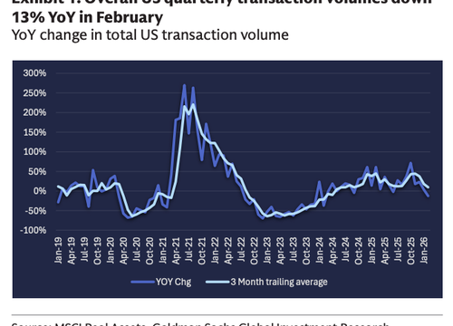 Goldman real estate analyst Julien Blouin wrote Wednesday that the initial February reading on CRE transaction volumes showed a 13% year-over-year decline. He noted that transaction data from MSCI Real Assets is typically “revised materially higher” and said the early print is not a major cause for concern.