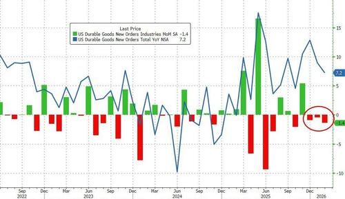 Preliminary headline durable goods orders for February fell 1.4% MoM (worse than the -1.2% MoM exp). That is the third monthly decline in a row (the first 3-month decline since Nov 2019)