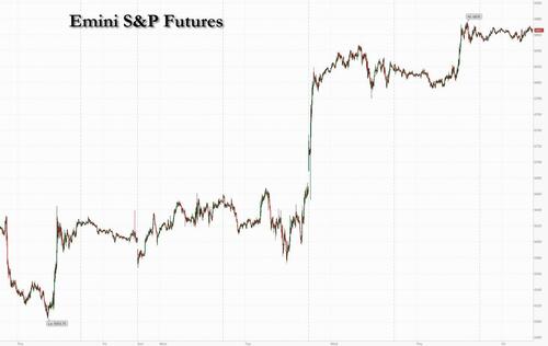 US equity futures are flat, recovering from an earlier drop, and set to extend a seven-day rally, the longest since October, as investors looked to talks between the US and Iran for signs a fragile truce can hold while bracing for a big jump in today’s CPI report (full preview here). As of 8:00am ET, S&P futures were up 0.1%,on track for their biggest weekly advance in almost a year. Nasdaq futures rose 0.2%, its winning streak is the longest since September, led once again memory stocks while Mag 7 were mixed (NVDA -0.5% and MSFT +0.5%). Europe’s Stoxx 600 gained 0.8% as Ukraine’s top negotiator with Russia expressed optimism about peace talks. Overnight, headlines were mostly quiet as investors continue assessing the negotiation progress between the US and Iran. Hormuz and Lebanon remains the two key focuses. Meanwhile, a BBG headline this morning saying that Ukraine may be near a deal with Putin drove futs modestly higher; gold trades flat around $4,765. Bond yields are unchanged to 1-2bp lower, the 10Y TSY trading at 4.29%; oil is 1% higher to $98.6; base metals are mostly lower. Brent crude was steady at near $96 a barrel but on pace for its steepest weekly loss in nine months. On today’s calendar, we have March CPI due at 8:30 a.m. ET, followed by factory orders for February and final readings for February durable/cap goods at 10 a.m. University of Michigan Sentiment also due at 10 a.m.