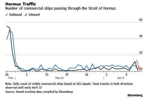 One day after a burst of traffic through the Strait of Hormuz, when according to Bloomberg 19 ships crossed in either direction while Trump said that as many as 34 ships crossed the waterway on Sunday, shipping through Hormuz slumped back down again Monday, reversing Sunday’s jump, as caution mounted ahead of a US naval blockade.