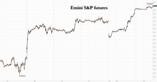 US equity futures, and global stocks rise while oil slides on a Reuters report that negotiating teams from the US and Iran could return to Pakistan later this week to resume negotiations to end the war in the Gulf, days after the first peace talks ended without a breakthrough, with chatter from Pakistani media that Trump is said to be in attendance. As of 8:00am ET, S&P 500 futures are up 0.2% while Nasdaq 100 contracts add 0.4%, as the cash index braces for a 10th straight day of gains, its longest streak of gains since 2021, with all Mag 7 stocks higher in premarket trading (Alphabet +0.9%, Amazon +0.7%, Apple +0.2%, Nvidia +0.6%, Meta Platforms +1.2%, Microsoft +1.1%, Tesla +1.9%) as tech / semis outperform other sectors; Cyclicals ex-Energy are leading Defensives. The risk-on rally is poised to continue today with the dollar weaker for a 7th day in a row while Treasuries were little changed. Gold rose 0.7% toward $4,800 an ounce. Bitcoin hit a four-week high. Brent fell 0.4% to below $99 a barrel, with the International Energy Agency estimating that the war will wipe out global oil demand growth for the first time since the 2020 pandemic, selling was boosted by Iran de-escalation hopes; Ags remain bid and precious metals continue to move inversely to the Dollar. Today’s macro data focus is on weekly ADP, Small Biz Survey, and PPI. Headline PPI (YoY expected to increase from 3.4% to 4.6%) is expected to see a significant jump with Core PPI (YoY expected to increase from 3.5% to 3.8%) increases more muted. Big banks report Q1 earnings today with consumer health the key macro read-through.