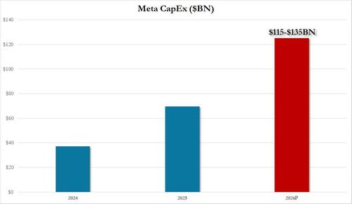 CEO Mark Zuckerberg has been pumping hundreds of billions of dollars into AI as he seeks to dramatically reshape his company’s core business around the technology, which has yet to generate any material returns proportional to the massive capex spend. In its latest earnings call, META raised its 2026 capex guidance to a record $115-$135 billion, more than double the prior years, and drastically more than anything META spent during the peak of its virtual reality phase.