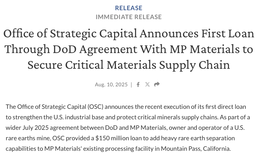 Direct equity & quasi-equity: Office of Strategic Capital’s $150M deal with MP Materials that included a 15% government stake plus long-term price floor. 10% direct stake in USA Rare Earth as part of a $1.6 billion package. Golden shares and board influence are now potential asks.